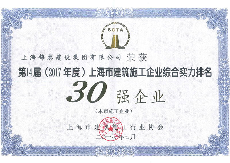 近日,由上海市建筑施工行業(yè)協(xié)會(huì )召開(kāi)第十四屆(2017年度)上海市建筑施工企業(yè)綜合實(shí)力排名暨2017年度上海市建筑施工企業(yè)誠信評價(jià)評審會(huì ),并一致通過(guò),上海錦惠建設集團有限公司榮獲“第14屆(2017年度)上海市建筑施工企業(yè)綜合實(shí)力排名30強企業(yè)”稱(chēng)號,綜合排名位列第28名。同時(shí)被評為“2017年度上海市建筑業(yè)誠信企業(yè)”。