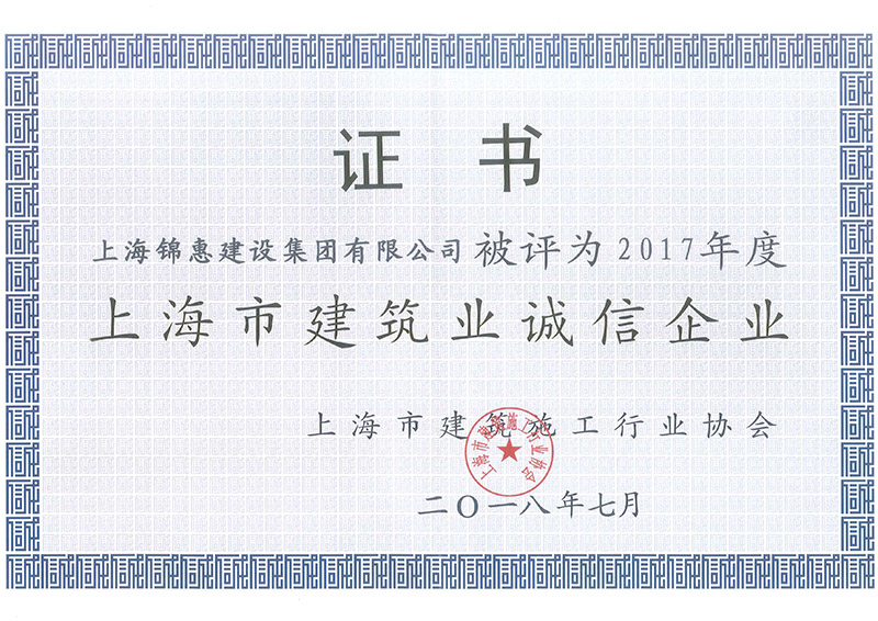 多年來(lái),公司始終堅持“以人為本、以質(zhì)取信、嚴格管理、穩中求進(jìn)”的宗旨。協(xié)會(huì )根據2017年度企業(yè)誠信建設相關(guān)內容考核后,決定授予集團公司“上海市建筑業(yè)誠信企業(yè)”稱(chēng)號。