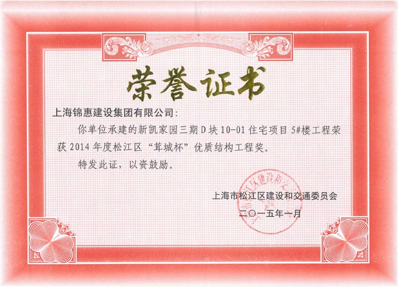當前位置:主頁(yè) > 企業(yè)榮譽(yù) > 企業(yè)榮譽(yù) >新凱家園三期D塊5#樓獲優(yōu)質(zhì)結構