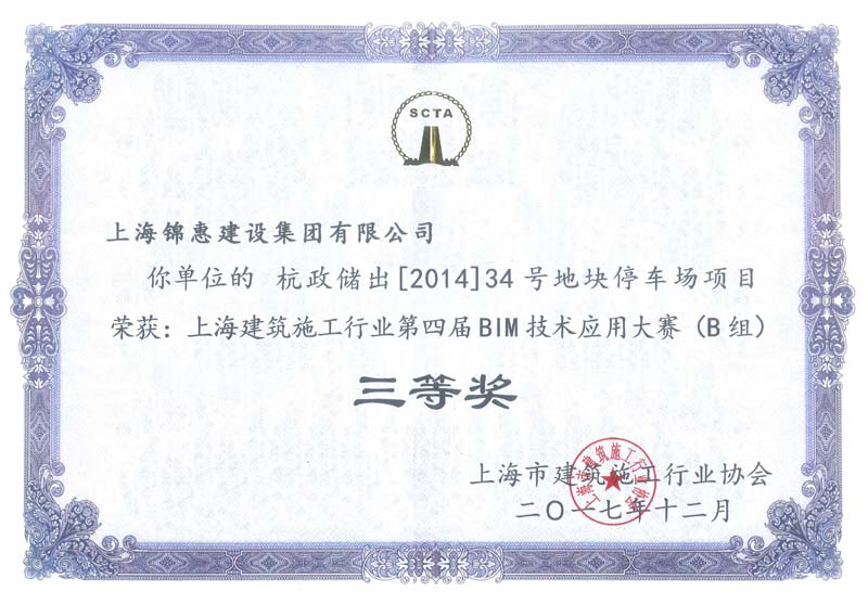 2018年1月17日,上海建筑施工行業(yè)第四屆BIM技術(shù)應用大賽優(yōu)秀成果發(fā)布暨頒獎大會(huì )隆重召開(kāi),上海錦惠建設集團有限公司承建的杭政儲出[2014]34號地塊停車(chē)場(chǎng)項目榮獲“上海建筑施工行業(yè)第四屆BIM技術(shù)應用大賽(B組)三等獎”。